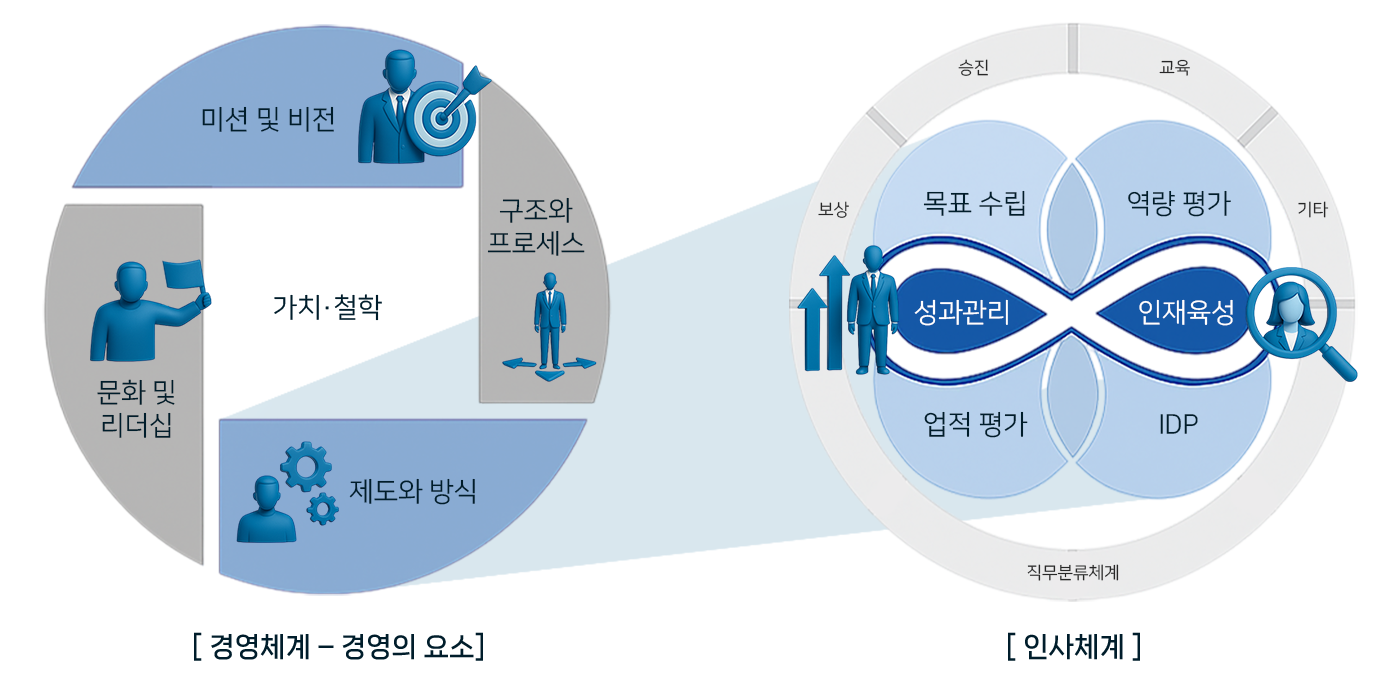 경영의 요소와 인사체계의 중앙에 성과관리(평가제도)가 있습니다.
