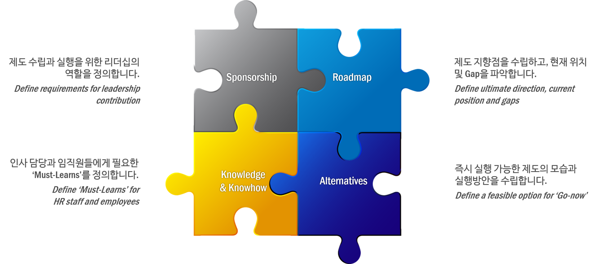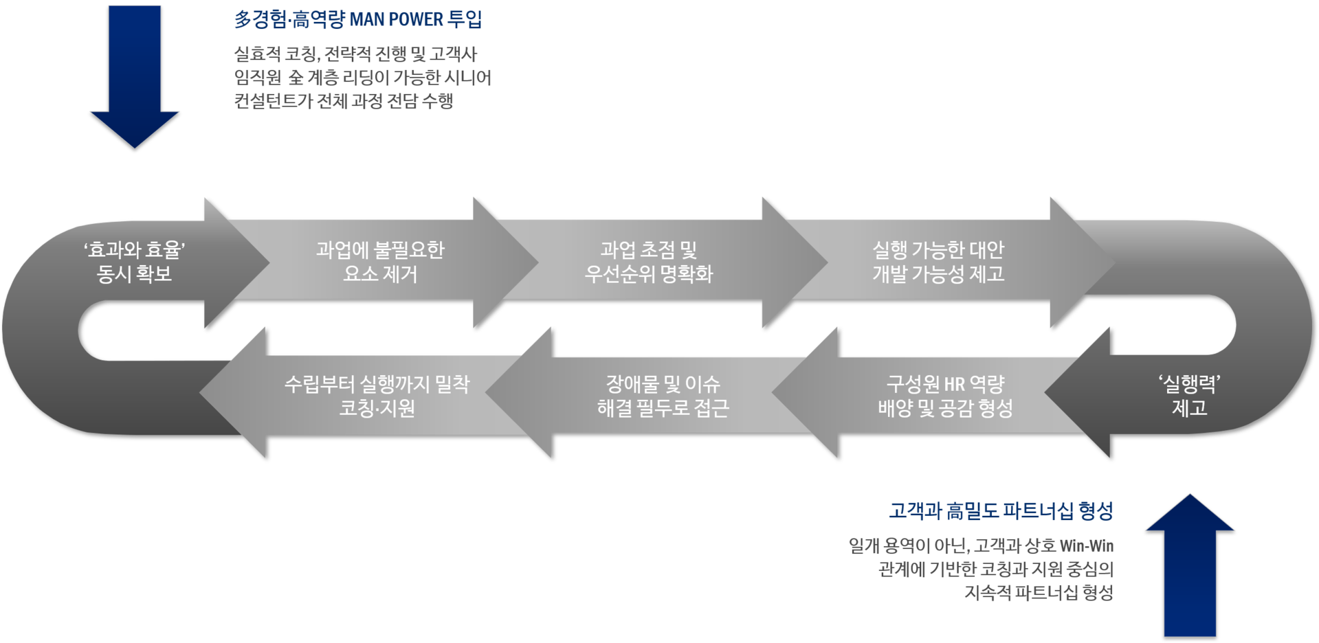 · 제도 수립과 실행 과정은 물론, Follow-up 및 以後 운영 과정에서도 최소 10년 이상의 경력을 갖춘 시니어 컨설턴트가 전담 ‘코치’이자 ‘주치의’의 역할을 해야 합니다.