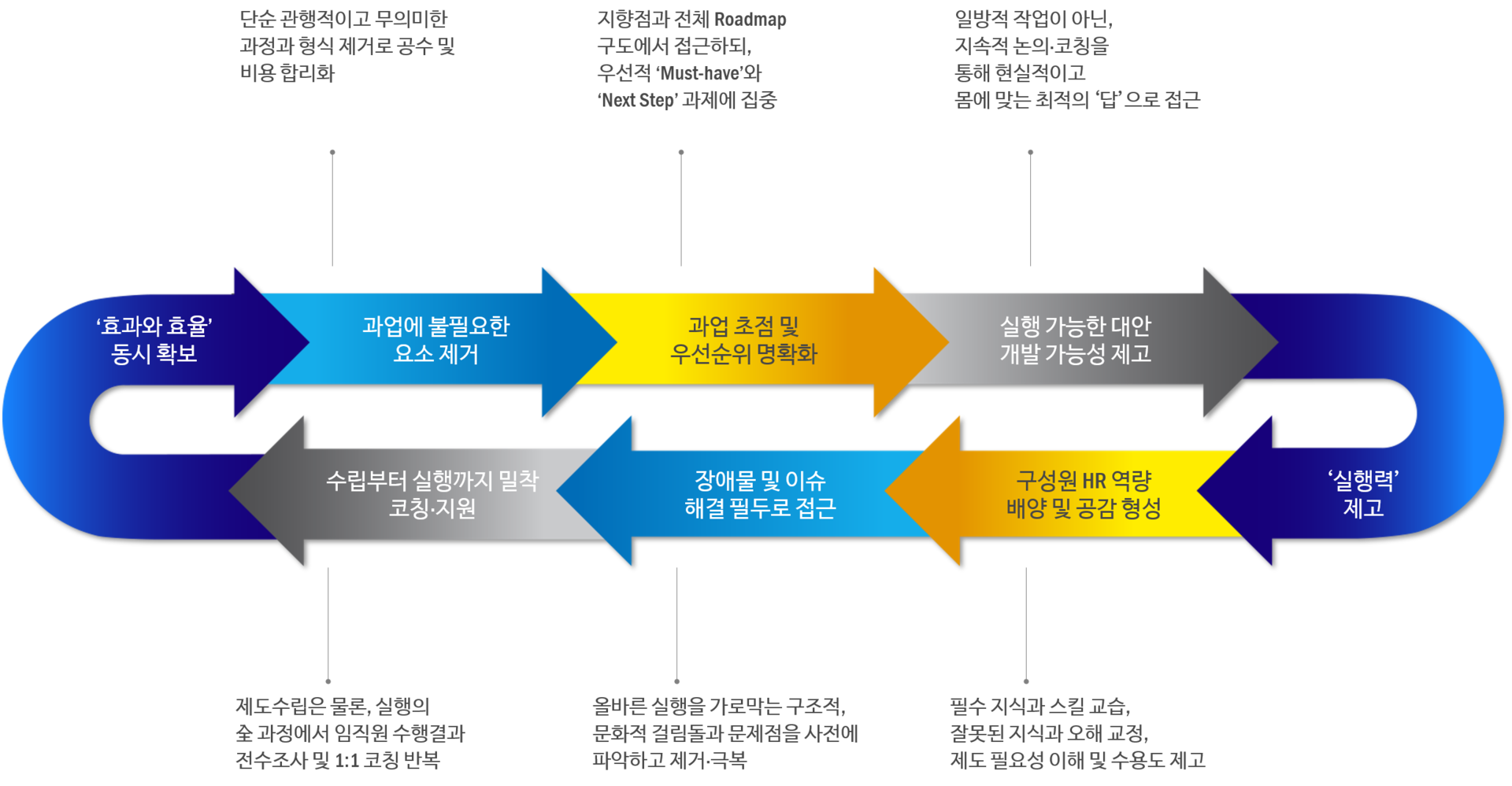 · 이슈 해결, 장애물 극복 및 현실적 대안 도출을 위한 논의와 코칭을 거쳐 실행 가능한 제도를 수립합니다.