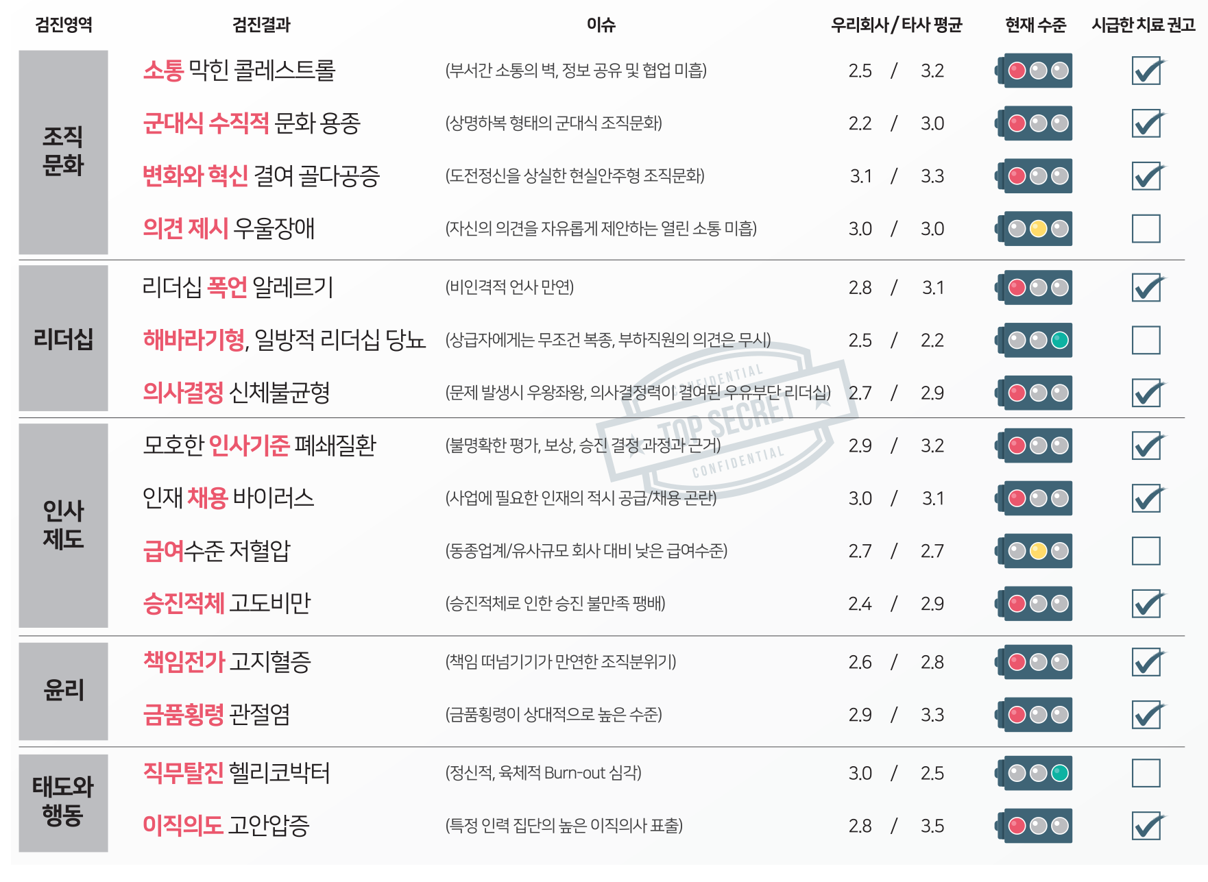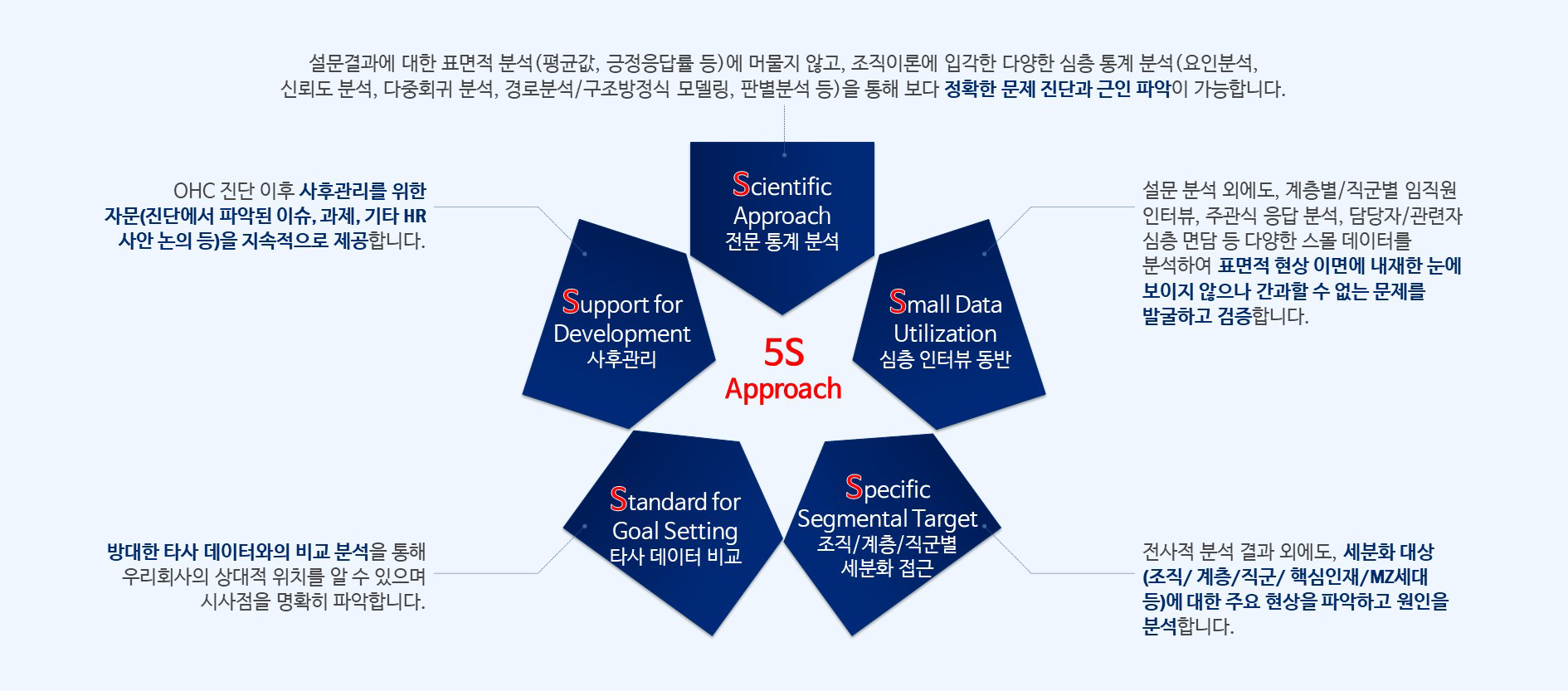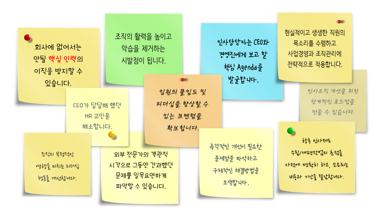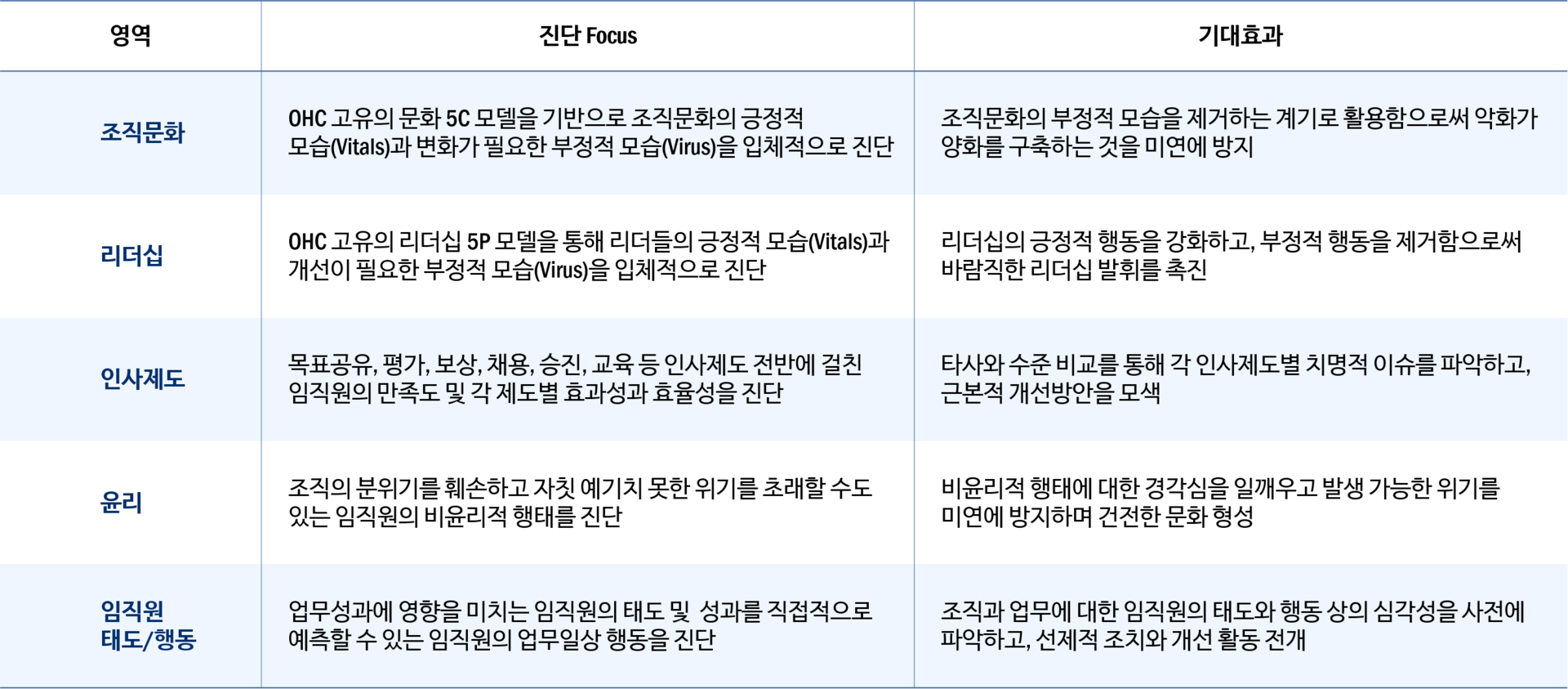 OHC 진단 이후 사후관리를 위한 자문(진단에서 파악된 이슈, 과제, 기타 HR 사안 논의 등)을 지속적으로 제공합니다.