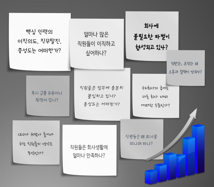 설문 분석 외에도, 계층별/직군별 임직원 인터뷰, 주관식 응답 분석, 담당자/관련자 심층 면담 등 다양한 스몰 데이터를 분석하여
