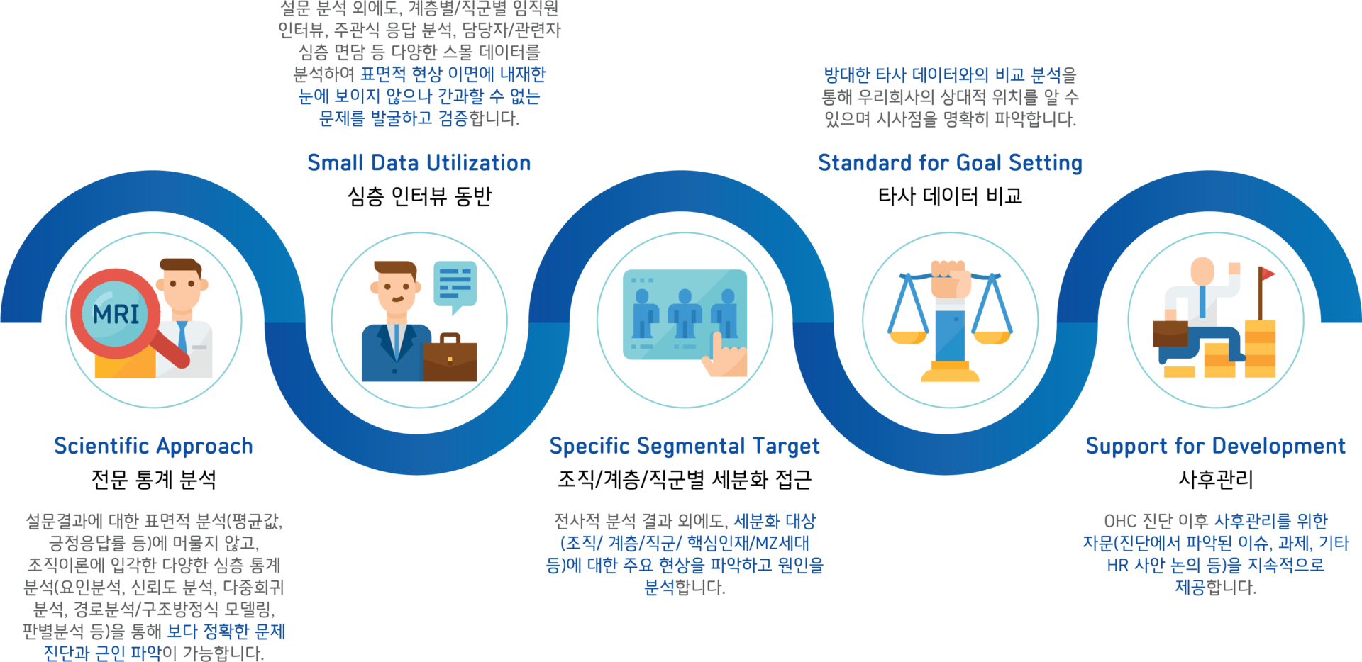 | 다층 통계 분석 기반 조직건강 진단 체계 | 조직이론에 기반한 시나리오 별 전사적 조직상태 파악, 군집 분석을 통한 직원 군집별 프로파일링, 오피니언분석, 상관분석, 회귀분석 등 통계적 기법을 사용한 조직의 현재 상태와 문제의 구조를 입체적으로 파악 및 진단 | 정밀한 데이터 기반 진단과 전략 타겟팅 가능, 문제 원인의 구조적 분석을 통한 정교한 실행 전략 수립 |